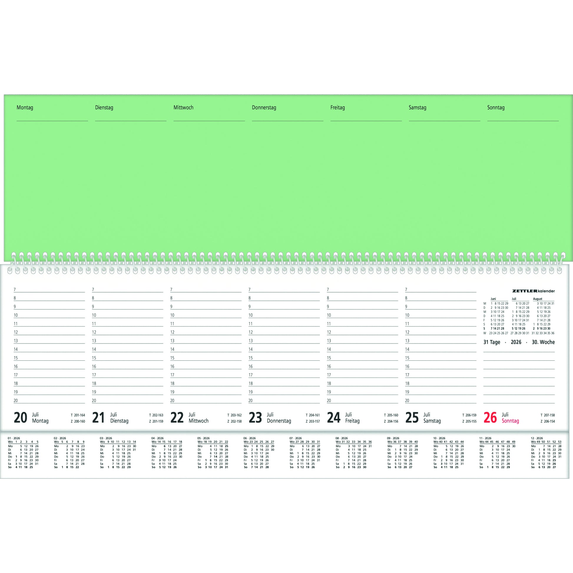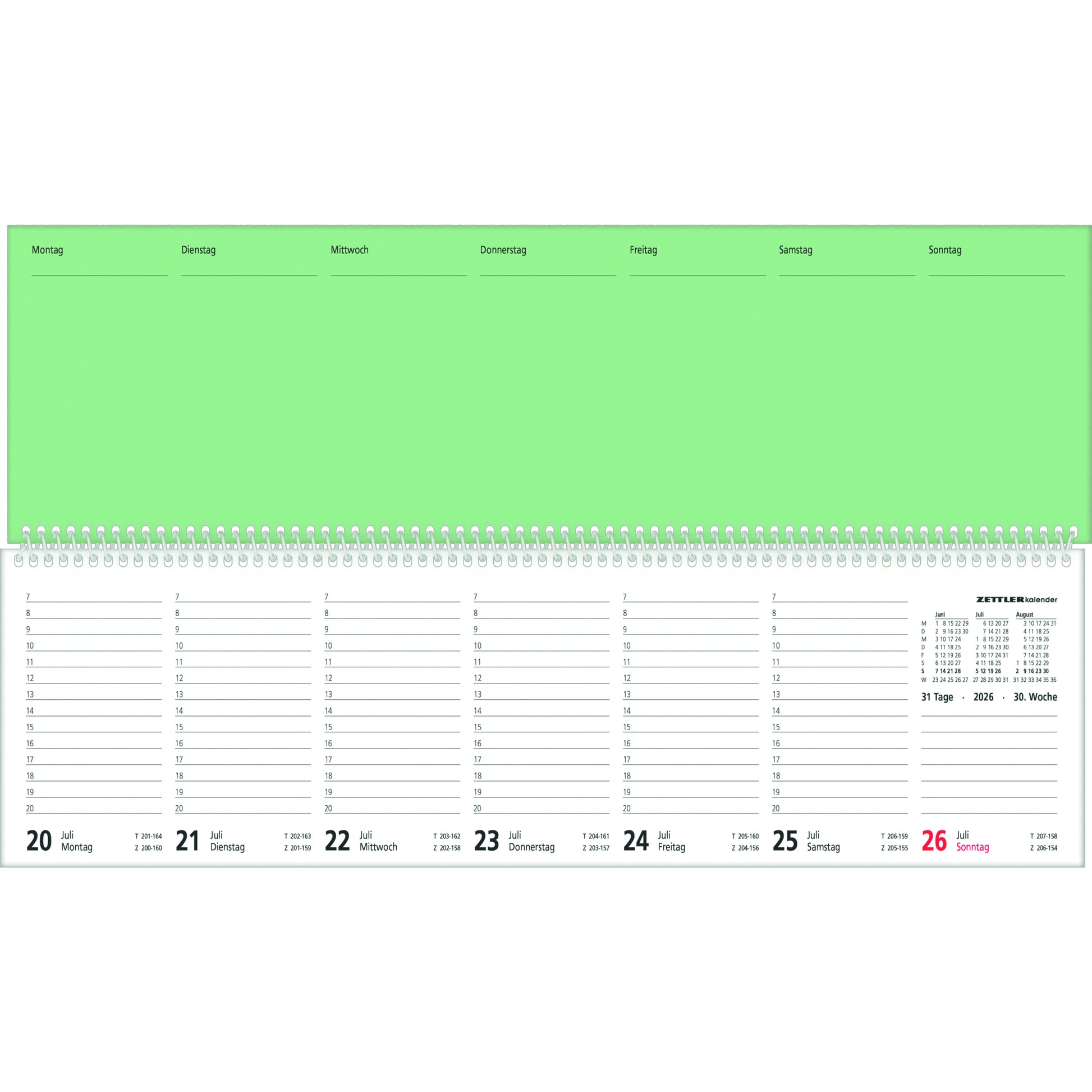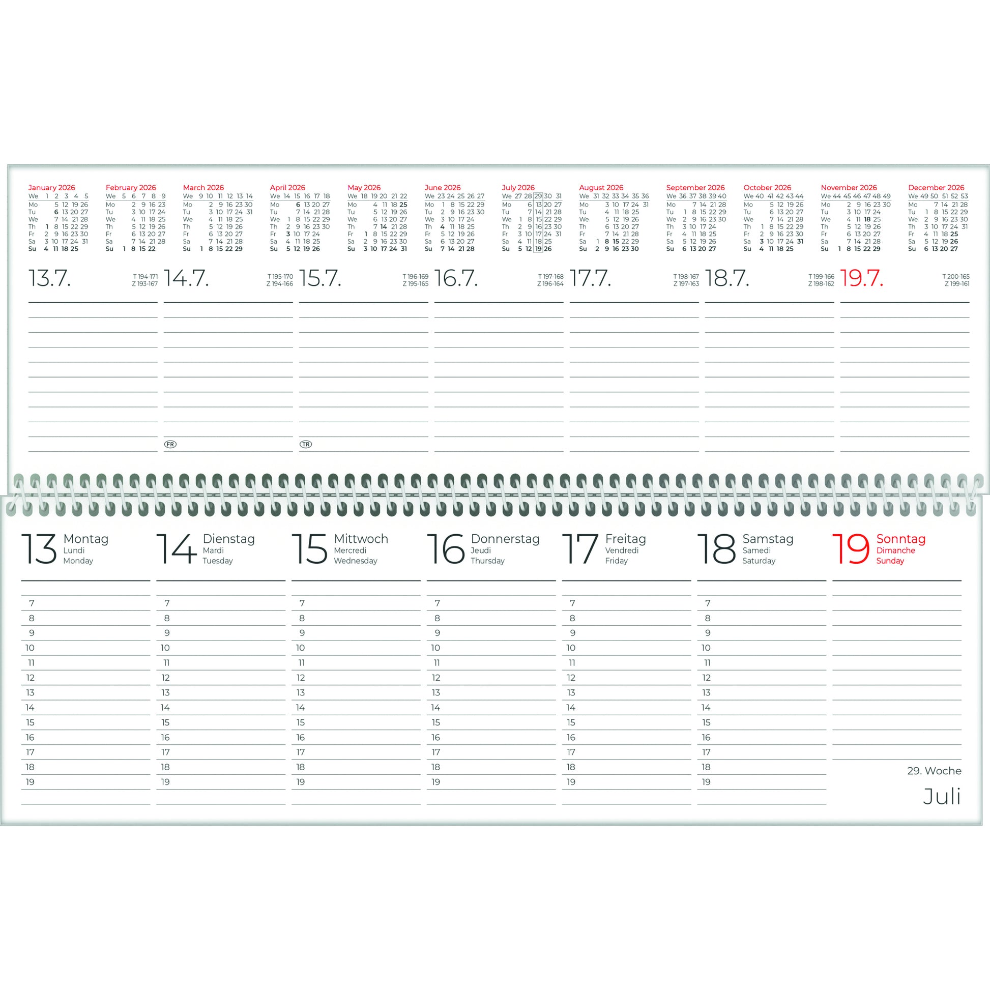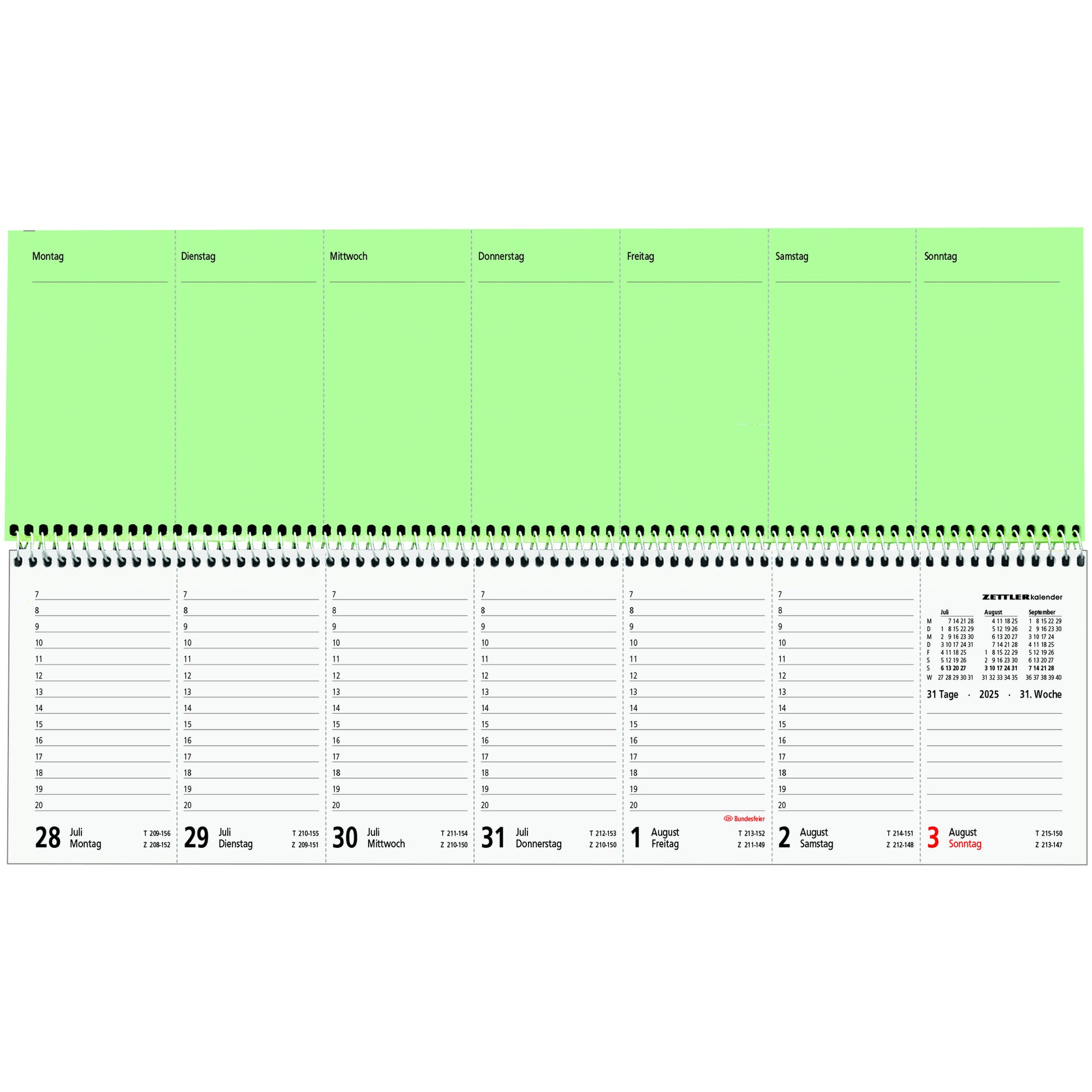 | Kalenderaufteilung | 1 Woche/2 Seiten |